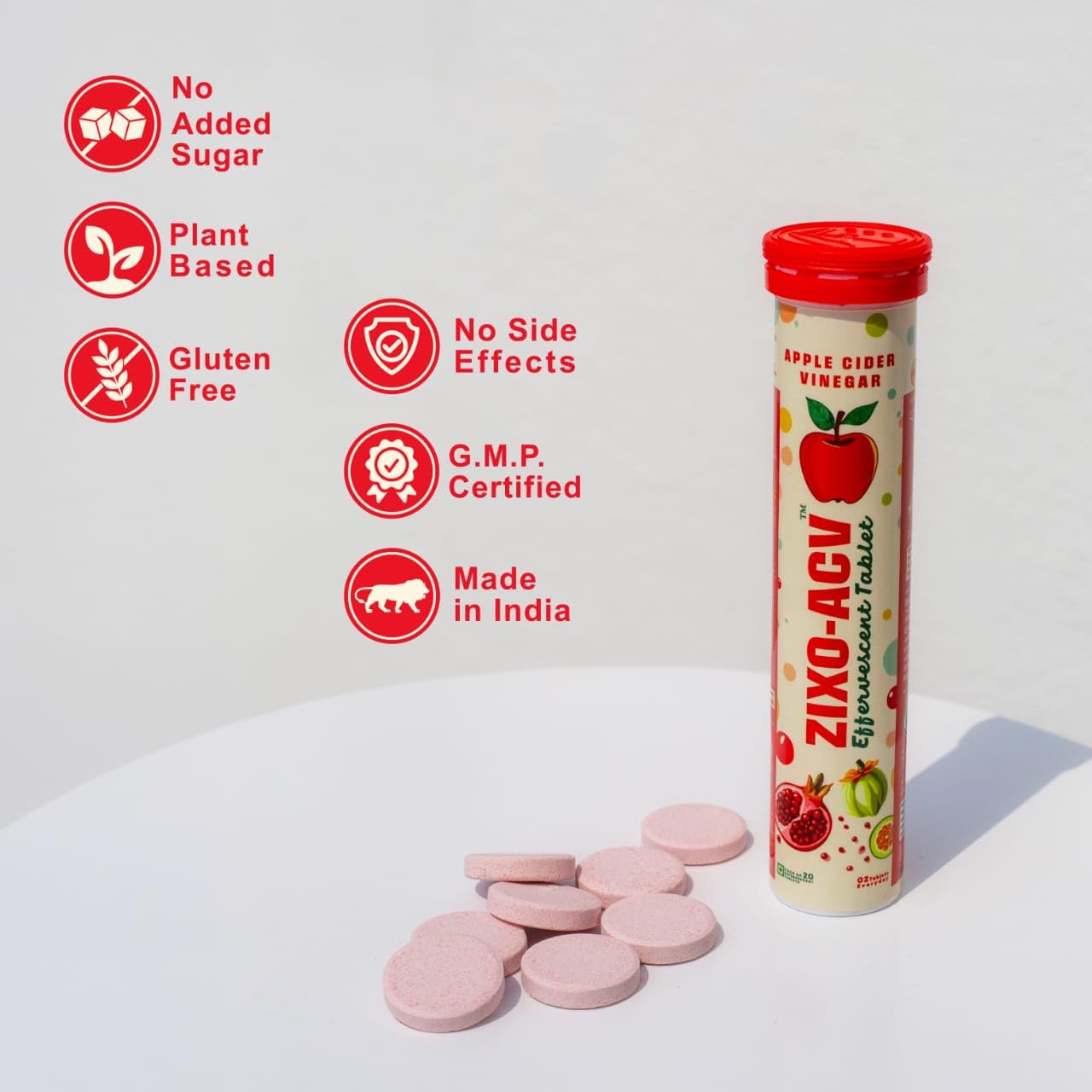 - Unlike many effervescent tablets in the market that are loaded with artificial sweeteners, synthetic colors, and unnecessary fillers, We believe in giving your body what truly needs—without compromising on quality or safety. That means its pure plantbased,no added sugar, no preservatives, no artificial flavors or colors. Just real, effective ingredients that support your health naturally. With ZIXO-ACV you're sipping smarter—because your wellness deserves purity, not compromise.